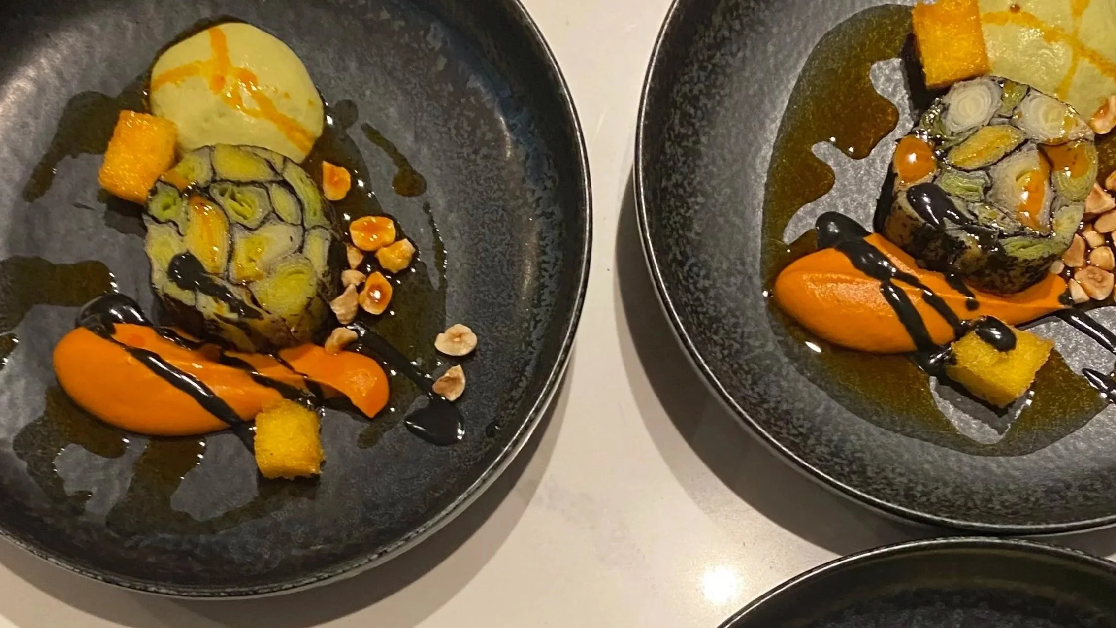 However, the undisputed highlight of the evening was a deconstructed Ashed Leek Mosaic. Inspired by the Catalan Calçotada that I just had experienced during my road trip through northern Spain and France, I reimagined the traditionally messy rustic dish into a refined plate featuring ash-rubbed calçots, black garlic aioli and a smoke-kissed romesco.